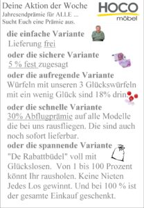 Bei HOCO findest Du alles was Du für dein Wohlfühl Zuhause brauchst. Funktionell mit praktischen und schönen Lösungen. Und mit unseren vielfältigen Aktionen ist natürlich auch Gelegenheit zum sparen. Zum Jahresende gibt es bei uns traditionell die Jahresendprämie. Nutzt die Gelegenheit und gönnt Euch was Schönes zum Jahresausklang.
