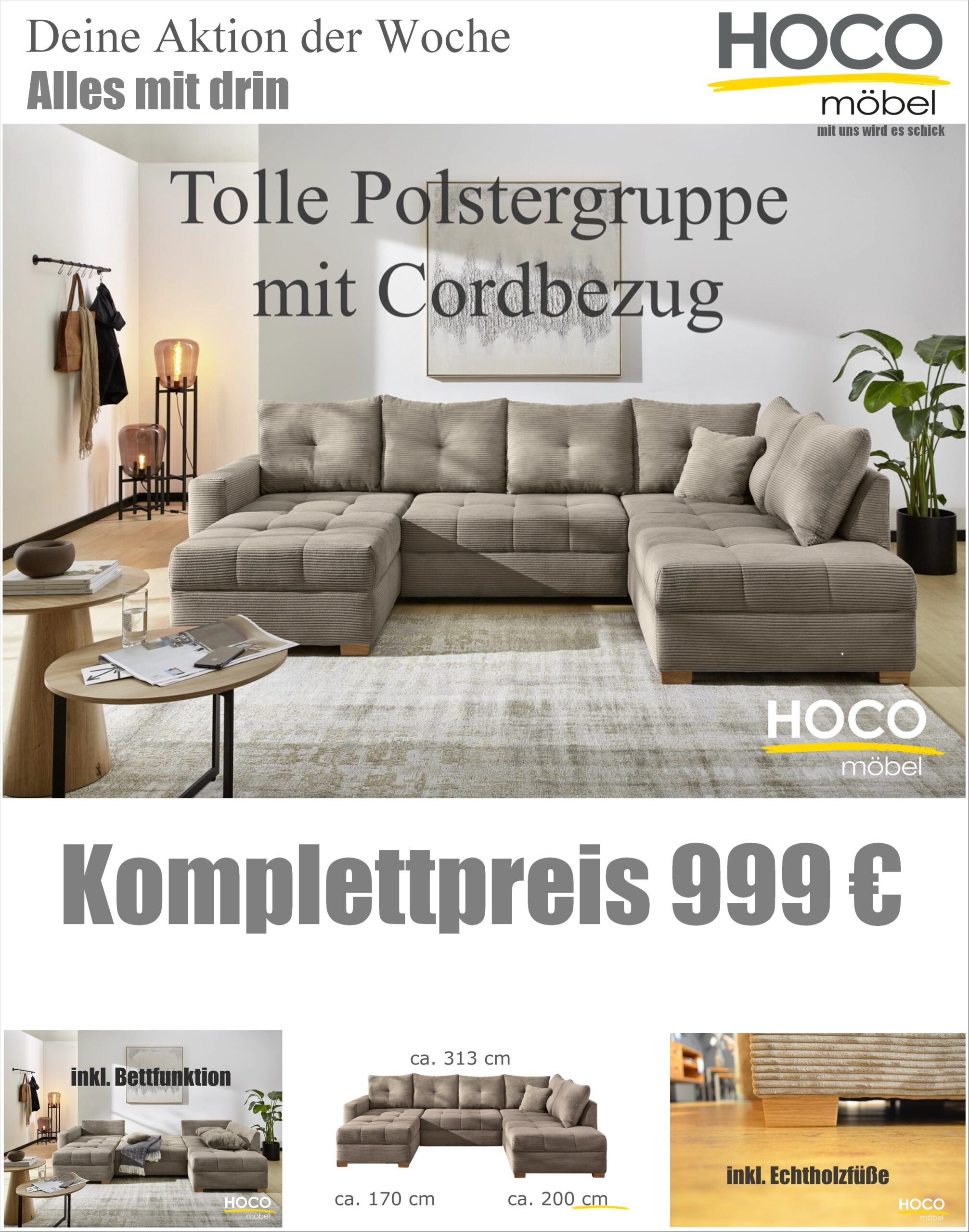 Bei HOCO findest Du alles was Du für dein Wohlfühl Zuhause brauchst. Funktionell mit praktischen  und schönen Lösungen. Und mit unseren vielfältigen Aktionen ist natürlich auch Gelegenheit zum sparen. Diese Woche – Viel Couch für wenig Geld.